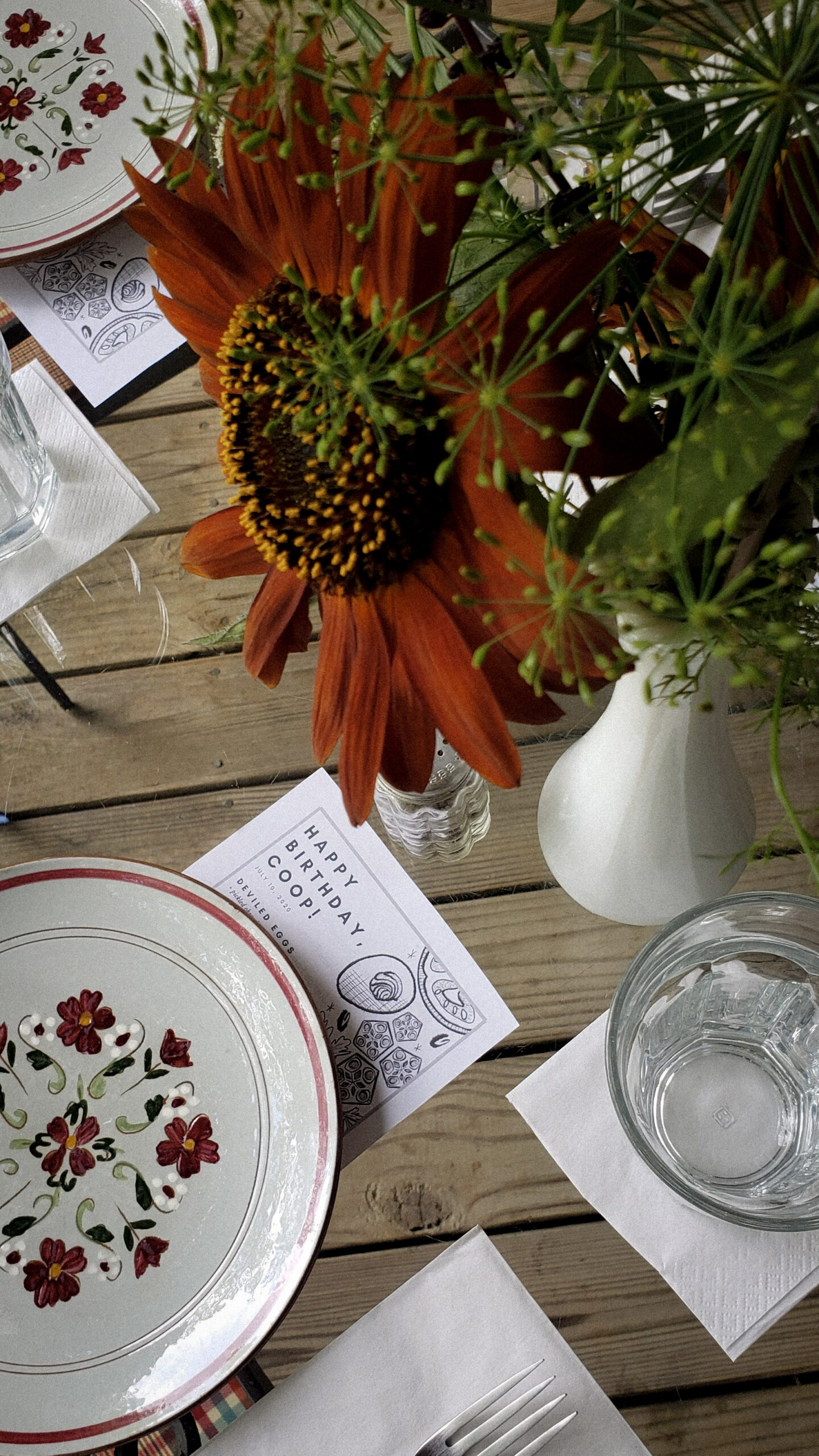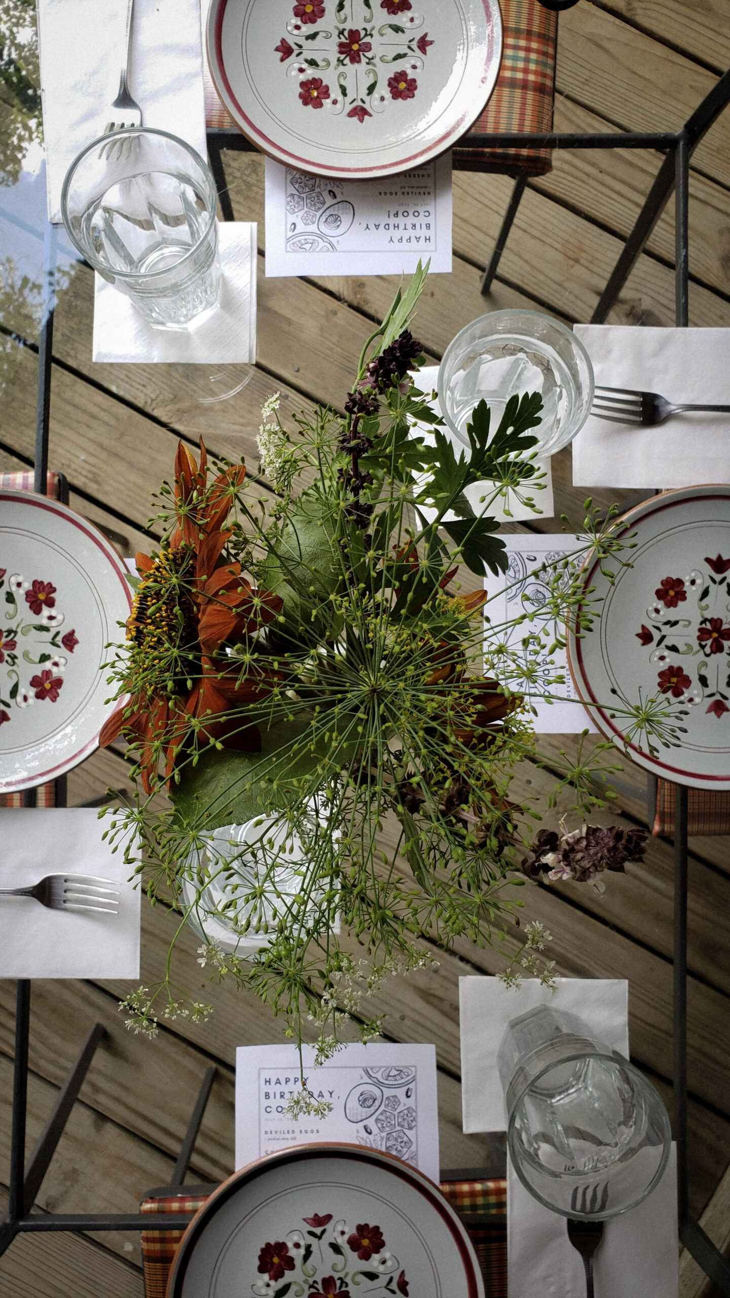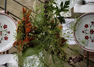 Flowers from the farm centerpiece surrounded by vintage table setting and custom menu designed in-house